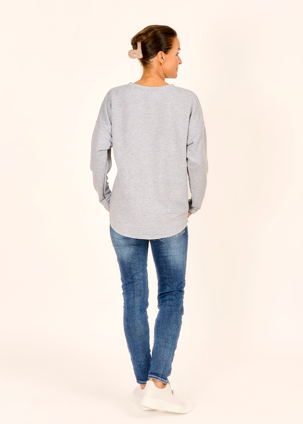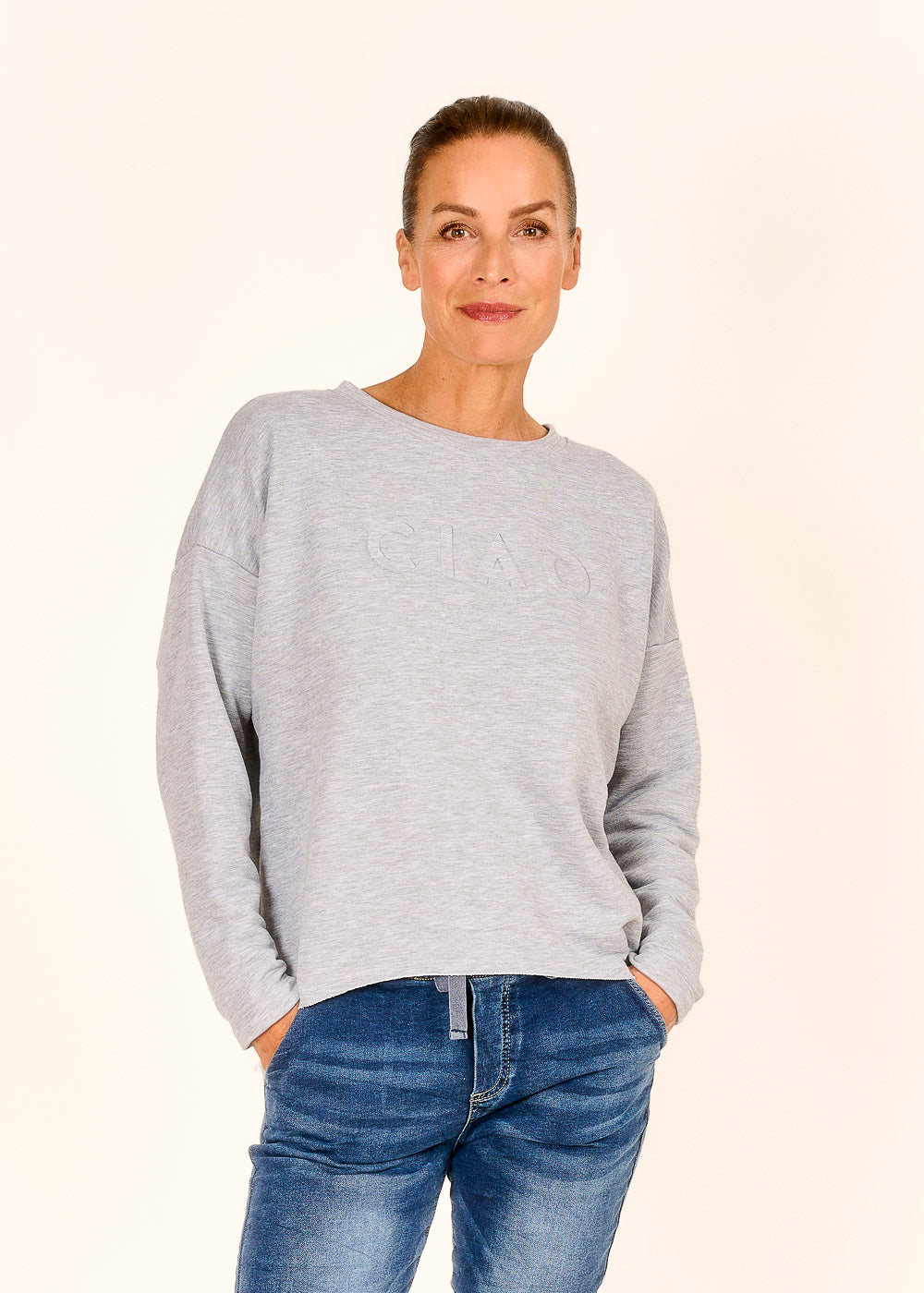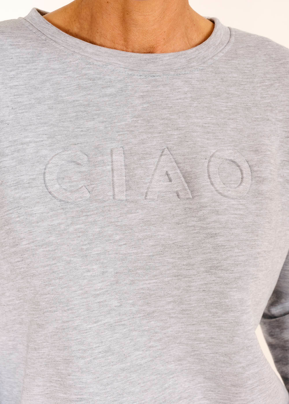 Entdecke deinen neuen Lieblingslook mit unserem "Sweaty in Grigio" – der bequeme Begleiter für entspannte Tage! Die coole Aufschrift "Ciao" verleiht deinem Outfit das gewisse Etwas und macht es zum perfekten Statement-Piece
