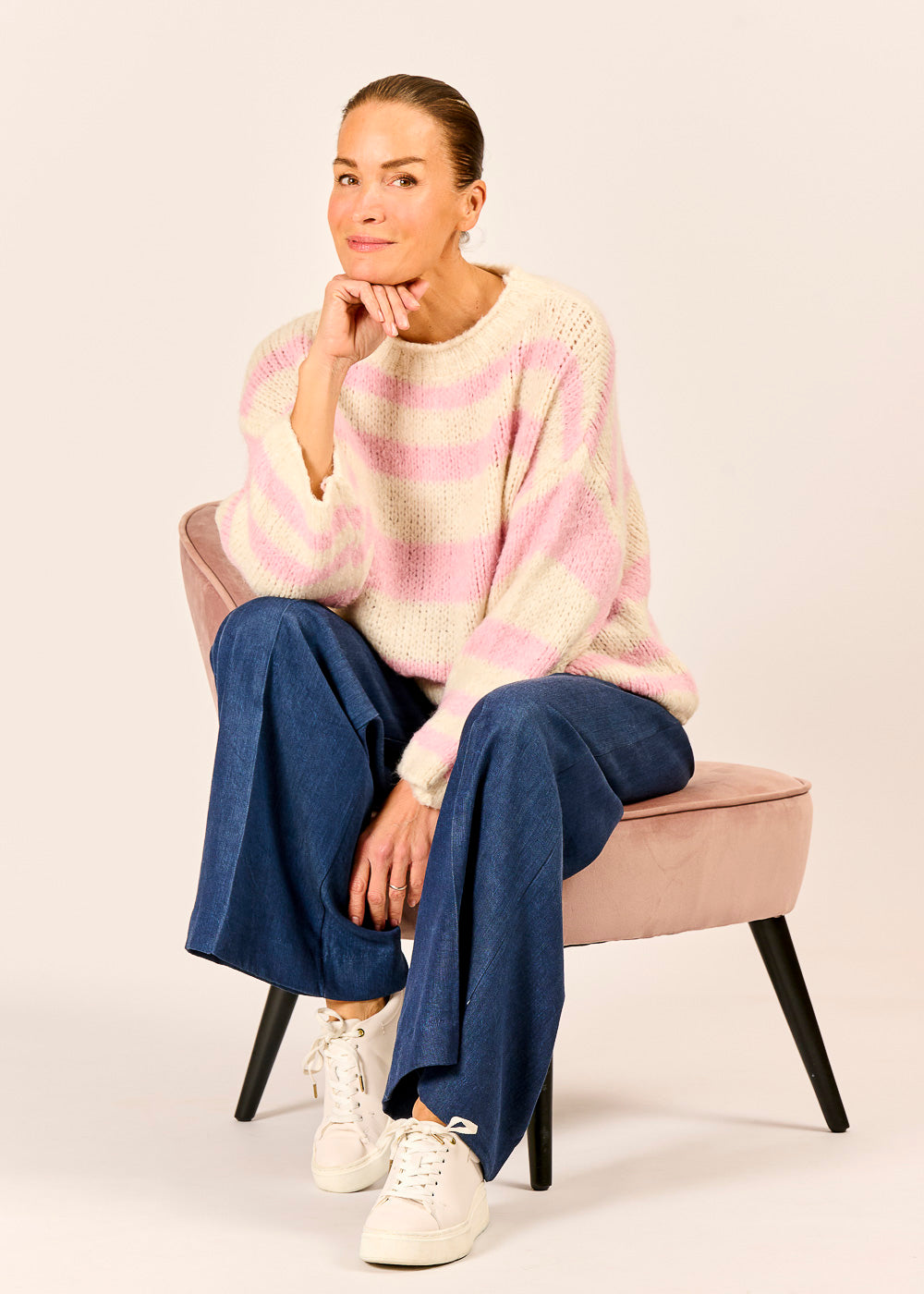Dieser kuschelige Streifenpullover ist ein charmantes Statement-Piece, das mit einer harmonischen Farbkombination aus hellem Beige (oder Creme) und zartem Rosa besticht. Der grobe Strick und der lockere Schnitt sorgen für ein wunderbar weiches und komfortables Tragegefühl. Ein perfektes Basic, das lässige Denim-Looks sofort mit einem Hauch von Frische und Verspieltheit belebt.