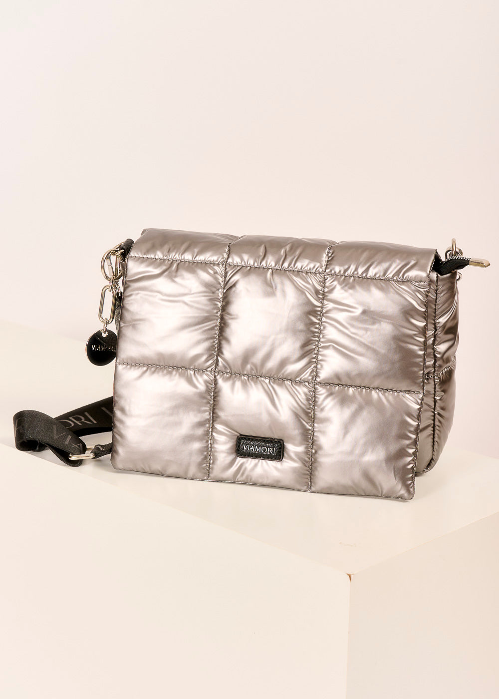 Glänzender Auftritt: Diese silberne Crossbody Bag mit Stepp-Design zieht alle Blicke auf sich. Das leichte, kompakte Format macht sie zum perfekten Begleiter für Tag und Nacht.