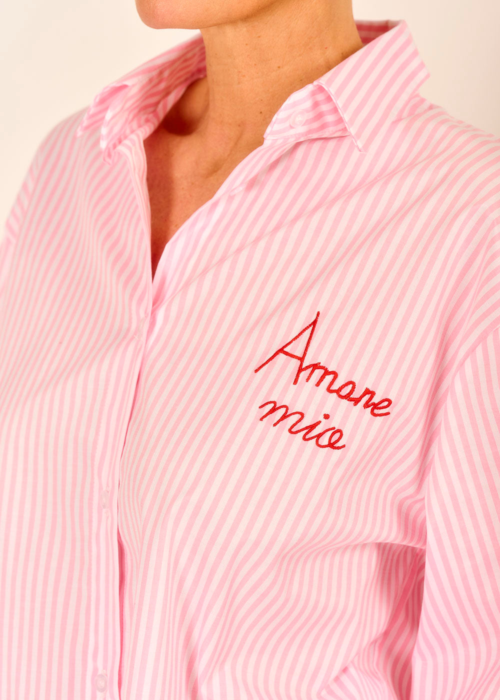 Die gestreifte Bluse ist ein echter Hingucker für verspielte, feminine Sommerlooks. Mit den aufgestickten Worten „Baci“ und „Amore mio“ trägt dieser Look eine kleine Liebesbotschaft aus Italien in sich. Der verlängerte Rückenteil verleiht der Bluse eine moderne Silhouette.