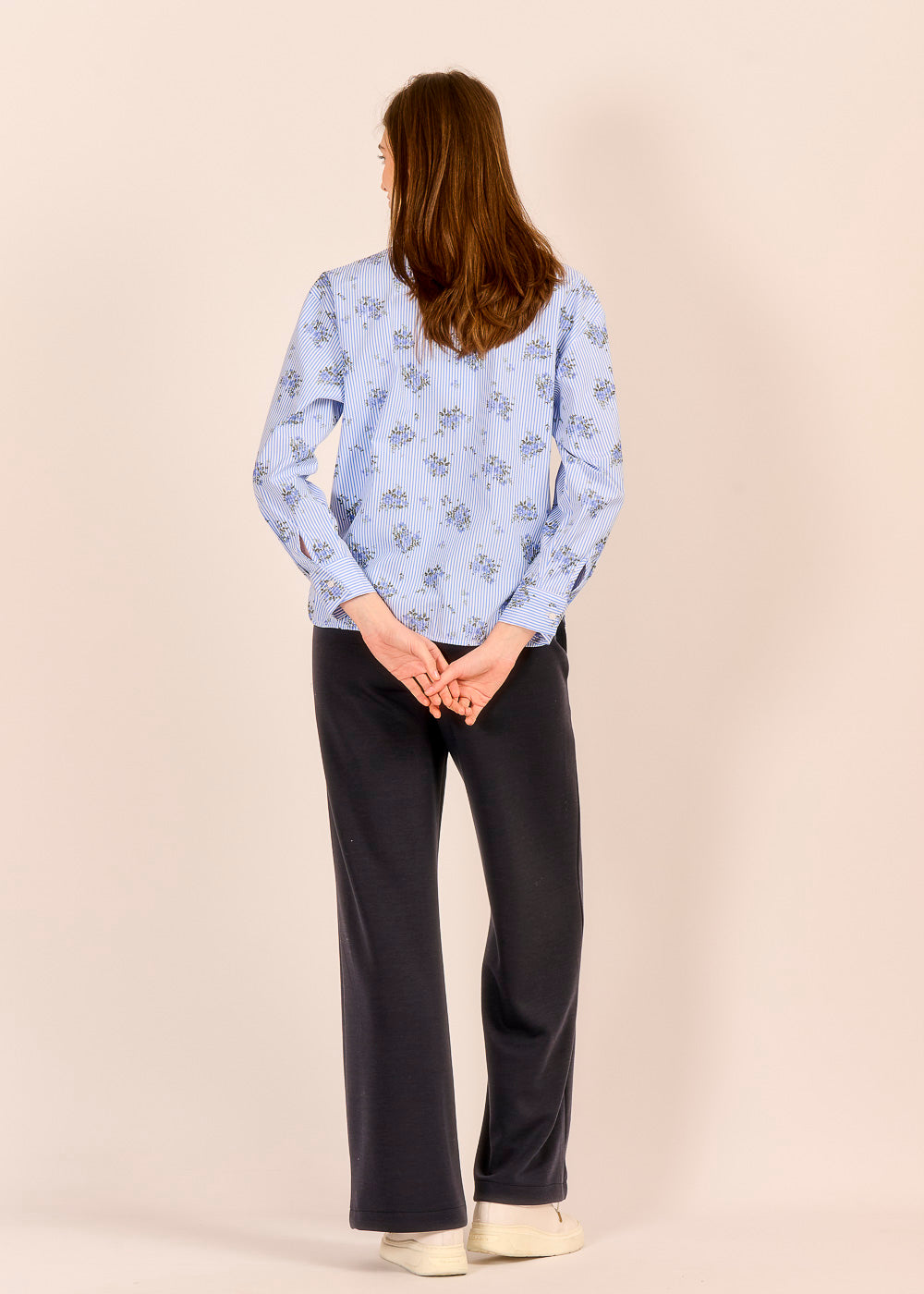 Diese Streifenbluse mit Blumenmuster vereint zeitloses Design, romantische Leichtigkeit und italienische Raffinesse, dank der Schlitze an den Seiten. Ob lässig in die dunkelblaue Hose gesteckt oder unter dem passenden Bomberino gestylt – diese Bluse ist ein echtes Lieblingsstück.